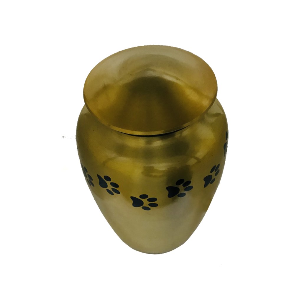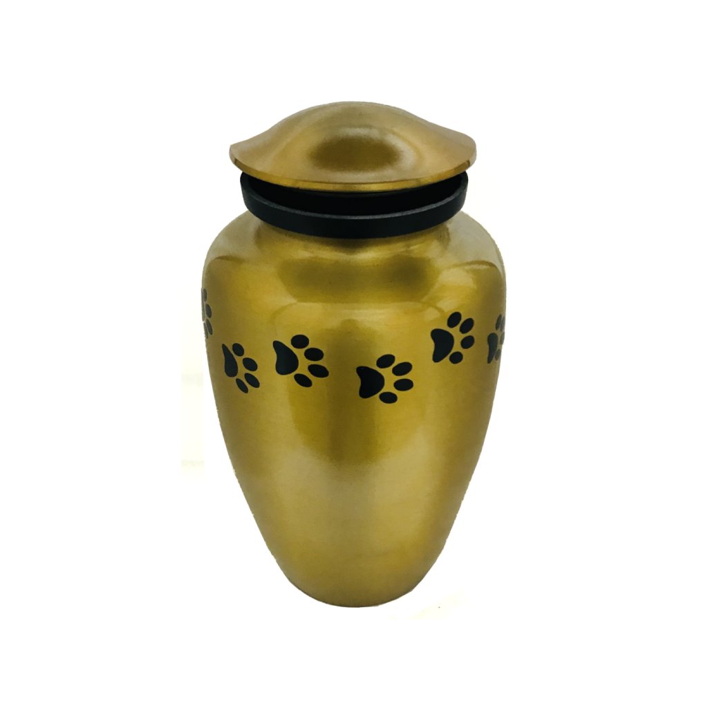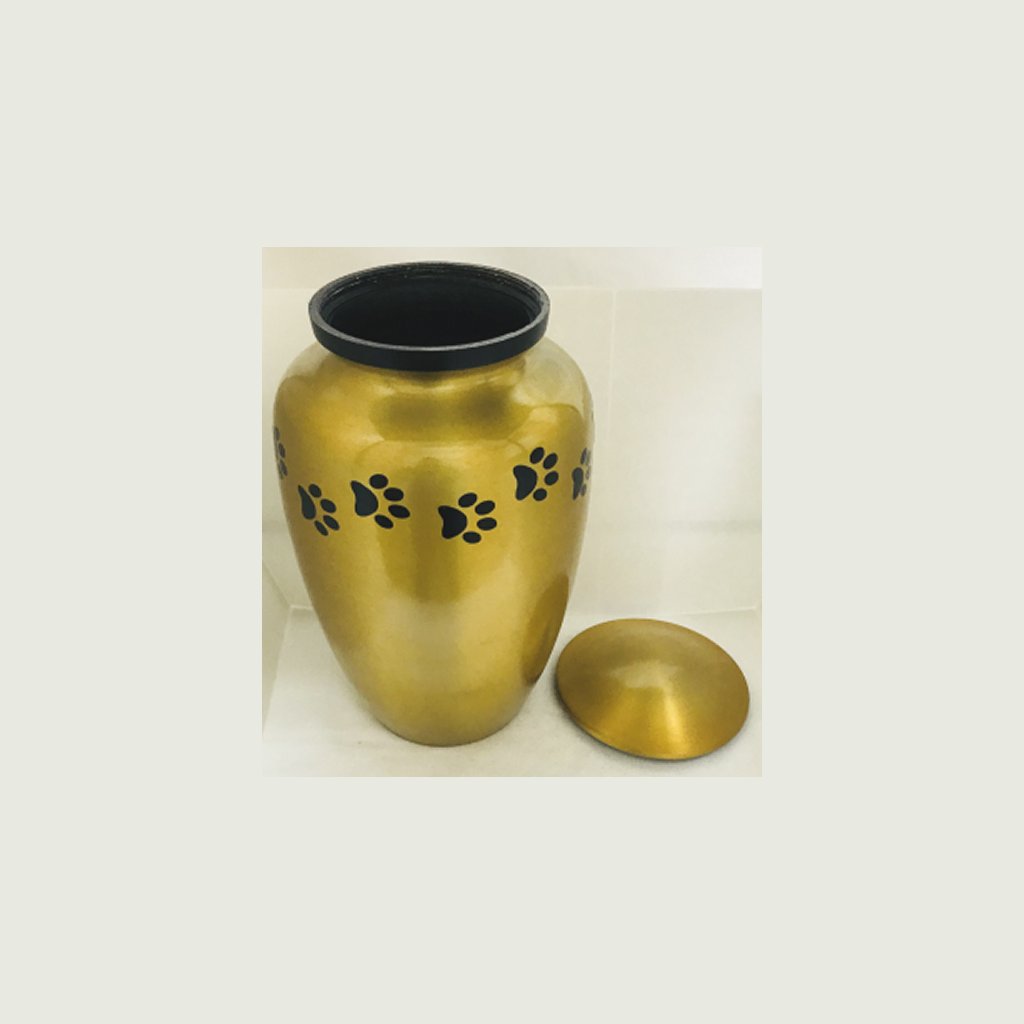 - These extra large size metal custom pet urns are available in satin gold finish with black paws & accent ring.