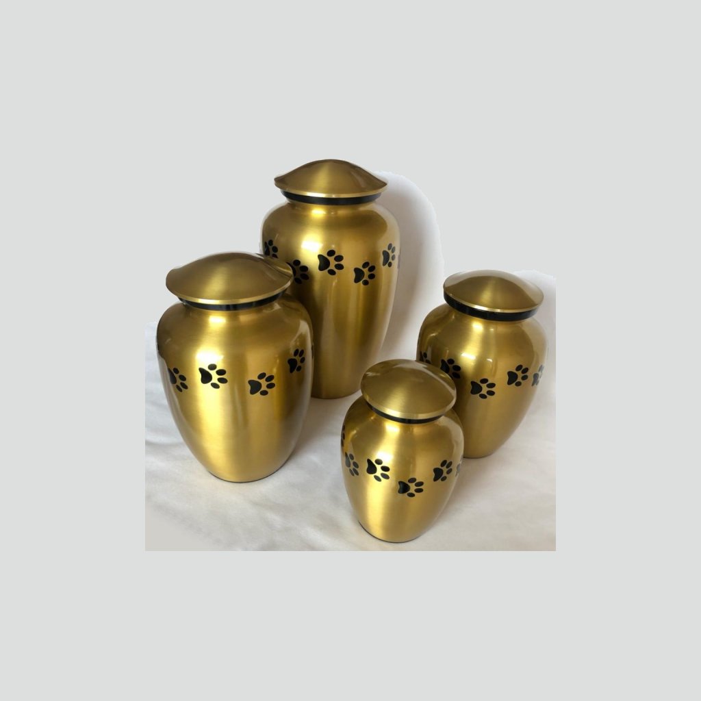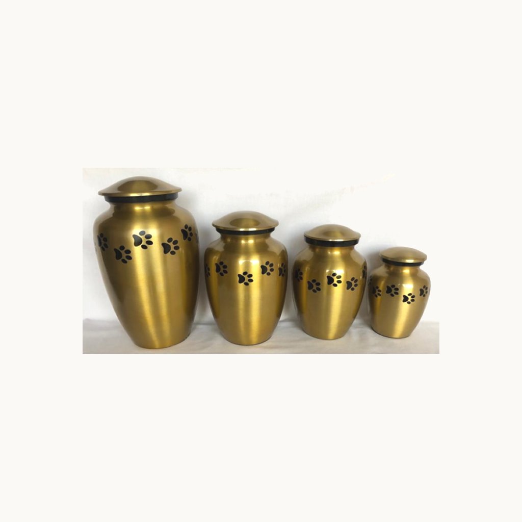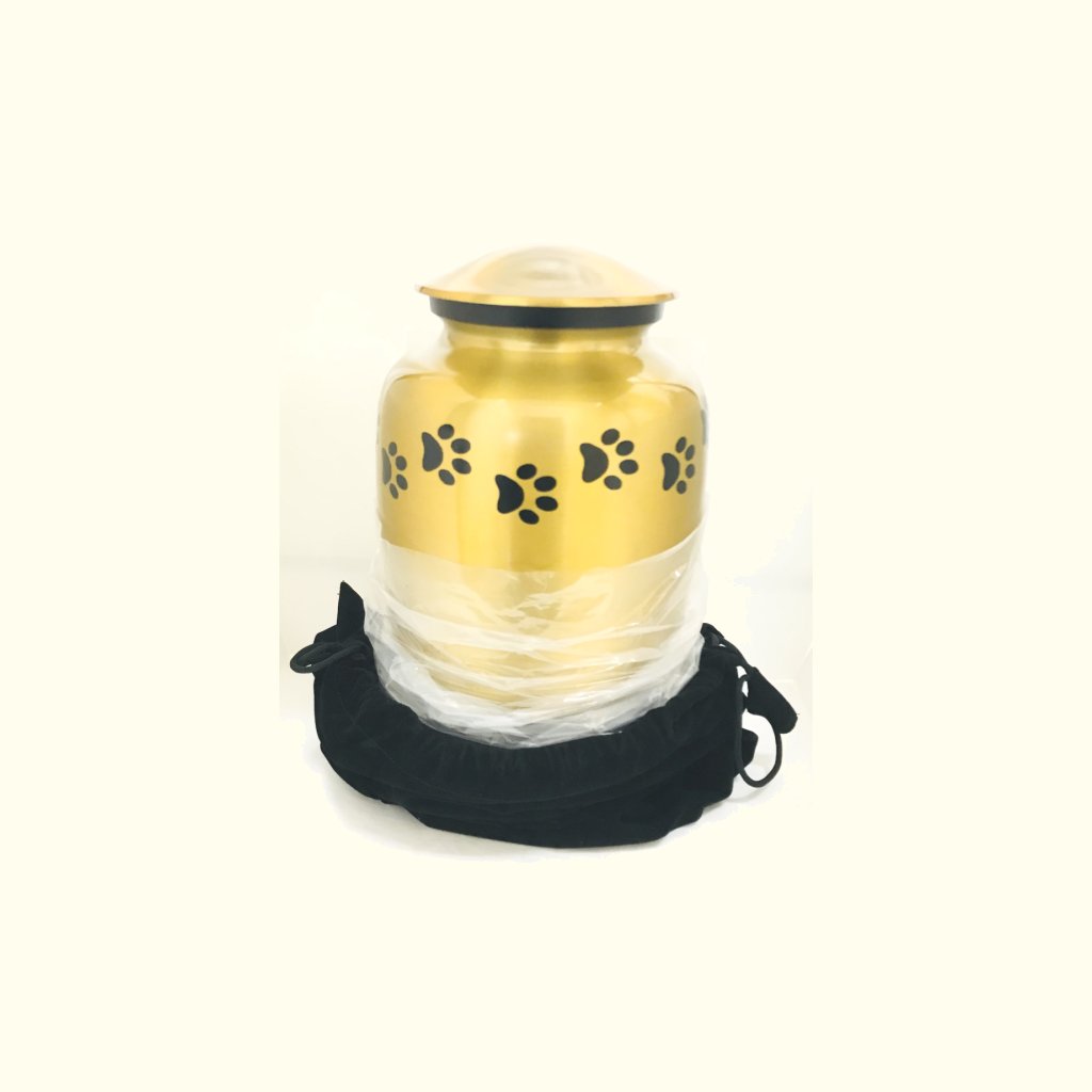 - These extra large size metal custom pet urns are available in satin gold finish with black paws & accent ring.