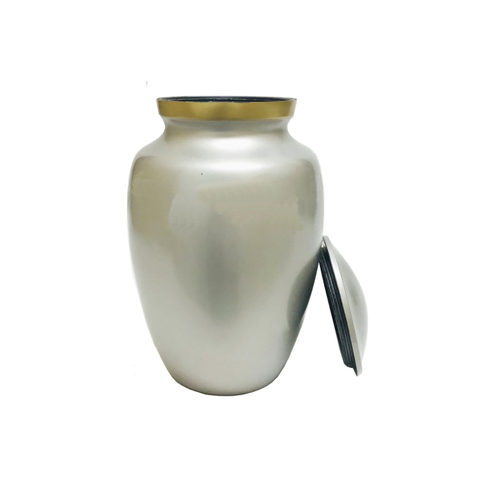 - These extra small size metal urn for baby ashes are available in pristine pewter finish with a gold accent ring.